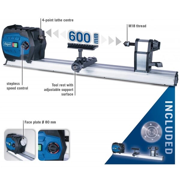 Scheppach DM600Vario er en brukervennlig og presis dreiebenk som passer perfekt for hobbyverkstedet, modellbygging og kreative prosjekter i tre. Den kombinerer kompakt design med kraft og fleksibilitet, og gir deg full kontroll – enten du er nybegynner eller har erfaring med tredreiing.
