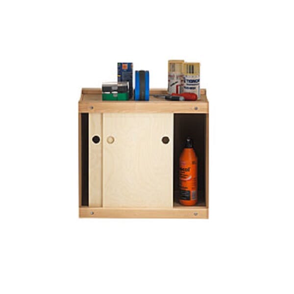 Skapet har en solid ramme i massivt bjørk og matchende finish som harmonerer med benkens arbeidsflate. Med pen og robust design gir skapet både medlemsskap og fleksibilitet – stedet for å lagre verktøy, spenner, maler og smådeler rett under arbeidsflaten.