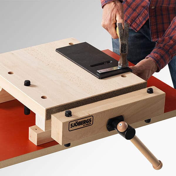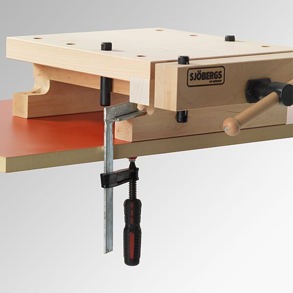 Praktisk liten mobil høvelbenk, fra Sjøberg. Den kan enkelt plasseres der du skal jobbe. Høvelbenken festes til et bord, benk eller tilgjengelig flate med tvinger eller skruer (ikke inkludert). Dette er en solid konstruksjon i velkjent Sjøberg kvalitet, hvor ø19mm benkehaker passer, 4 stk inkl. Den er laget i bøk. Passer blant annet ypperlig for treskjærere som vil jobbe på litt forskjellige plasser, snekkere som trenger en høvelbenk på arbeidsplassen eller vaktmesteren som skal ut å fikse noe. Dobbel rekke med hull for benkhaker.